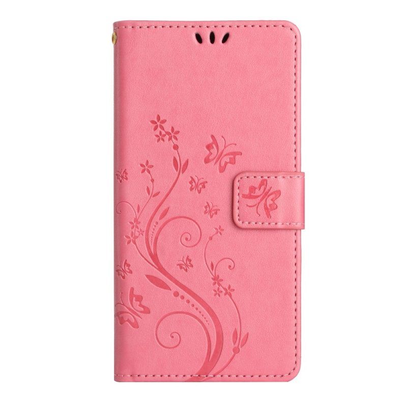Flip Case Für Samsung Galaxy A54 5G Mit Kordel Blumen Und Schmetterlinge Mit Riemen