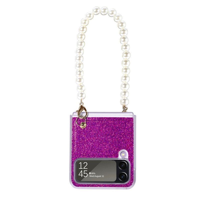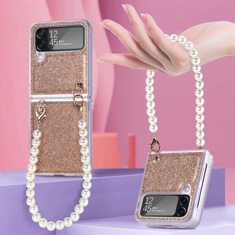 Schützen Sie Ihr Samsung Galaxy Z Flip 4 Mit Dieser Glitzernden Kunstlederhülle, Die Mit Einem Dekorativen Perlenband Ausgestattet Ist.