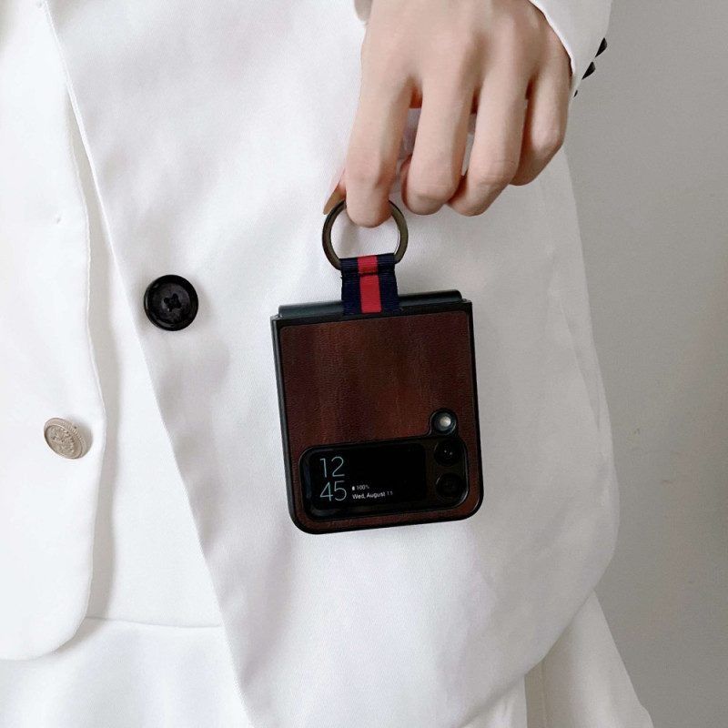 Ihr Samsung Galaxy Z Flip 4 5G Brennt Mit Dieser Hülle In Lederoptik, Die Mit Einem Speziell Für Das Telefon Entworfenen Stützring Ausgestattet Ist.