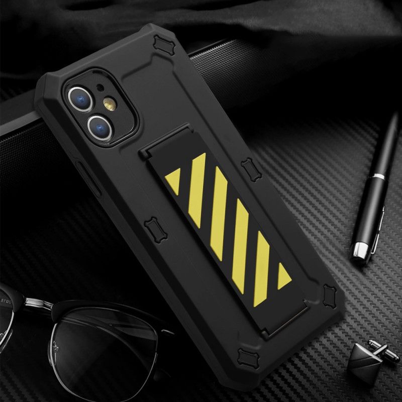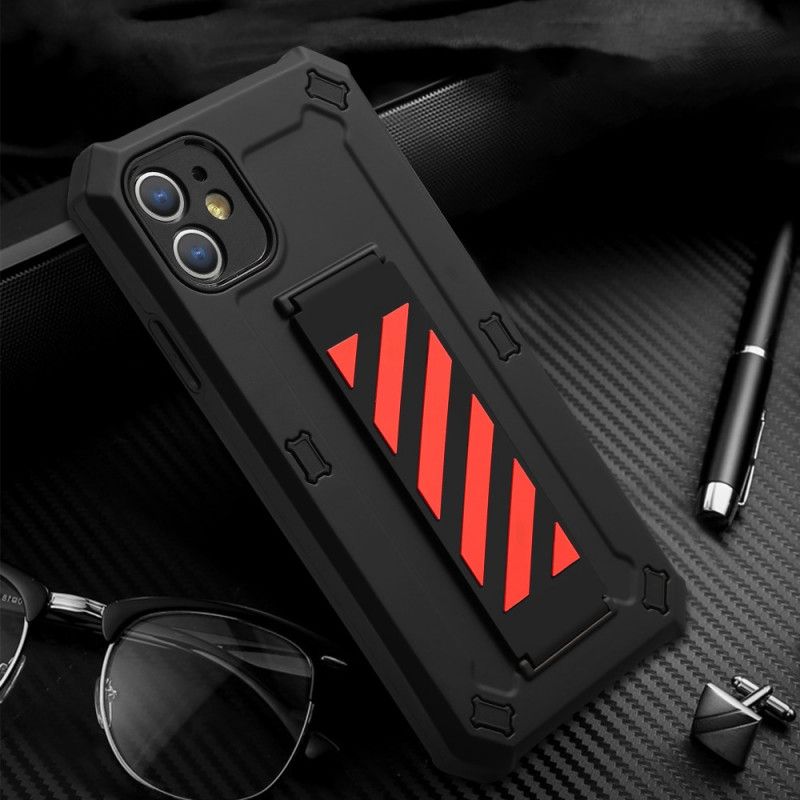Ihr iPhone 11 ist mit dieser Silikon- und Kunststoffschale, die mit einem manuellen Gurt ausgestattet ist, der als Stütze dient, absolut sicher.
