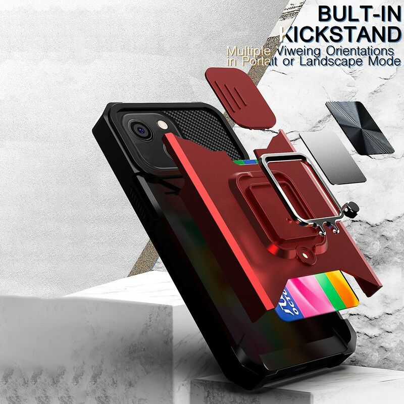 Schützen Sie Ihr iPhone 13 mit dieser Superhülle, die mit einem Kartenhalter, einem Stützring und einem Objektivschutz mit Reißverschluss ausgestattet ist.