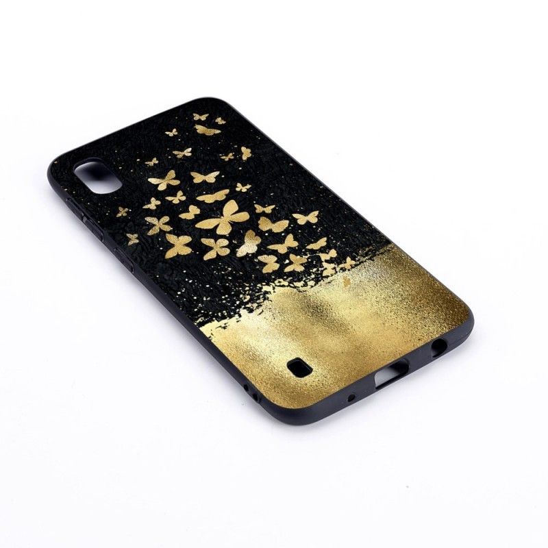 Ihr Samsung Galaxy A10 ist mit dieser erhabenen, flexiblen Silikonhülle, die mit wunderschönen goldenen Schmetterlingen verziert ist, absolut sicher.