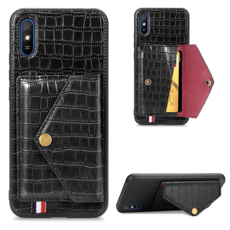 Das Xiaomi Redmi 9A-Gehäuse im Krokodilleder-Stil ist mit einem Kartenhalter ausgestattet, der auch als Freisprechfunktion dient.