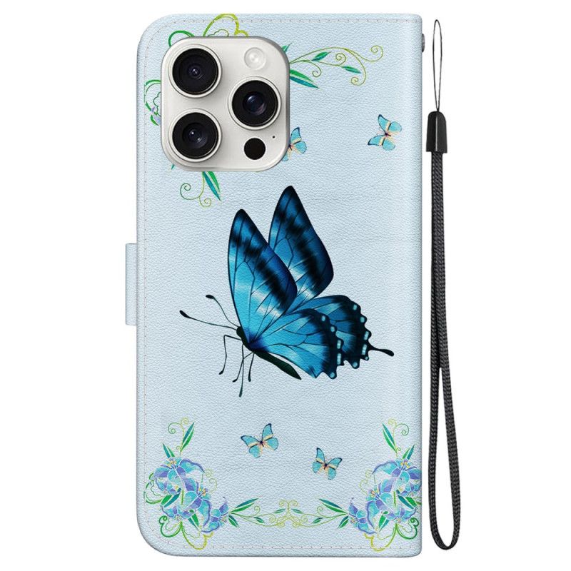 Lederhüllen iPhone 16 Pro Blauer Schmetterling Und Blumen Mit Riemen