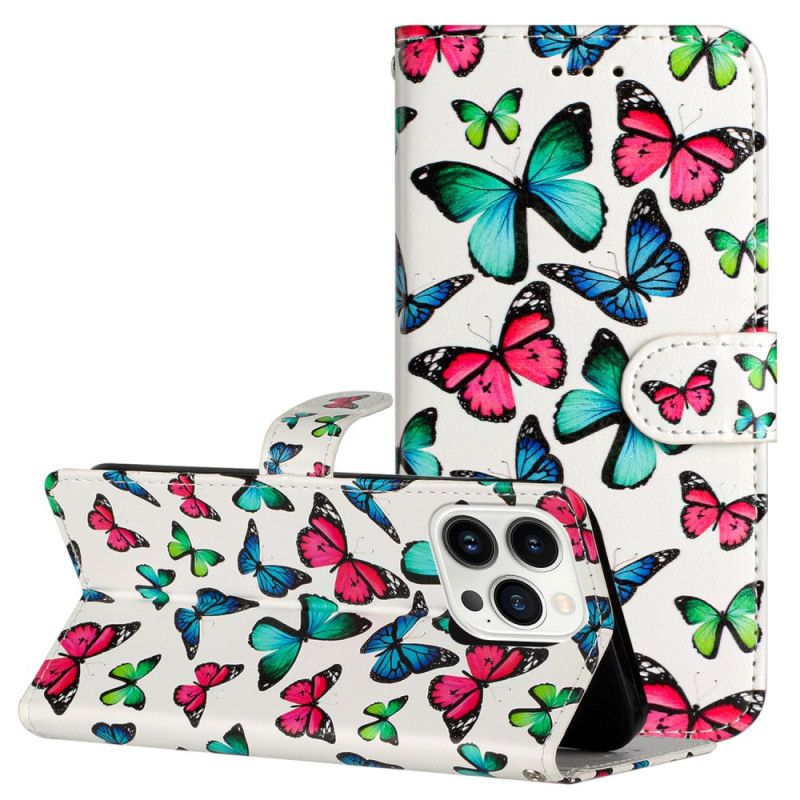 Lederhüllen iPhone 16 Pro Bunte Schmetterlinge Mit Riemen