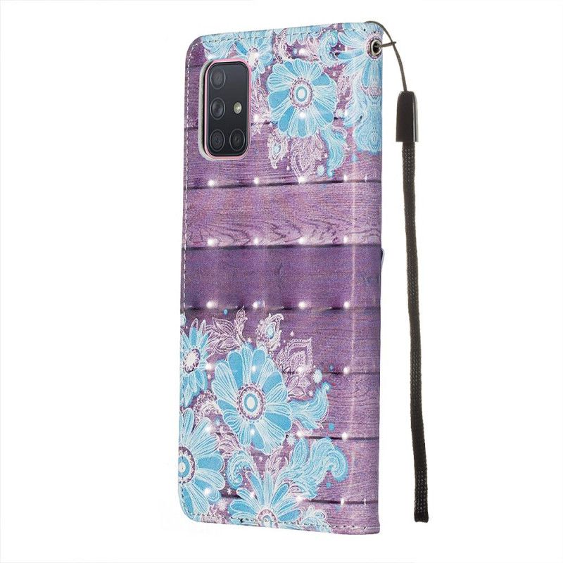 Die Abdeckung mit blauen Blumen schützt das Samsung Galaxy A71 perfekt und vollständig, während sie bereitgestellt wird Eine praktische Brieftasche und Halterung.