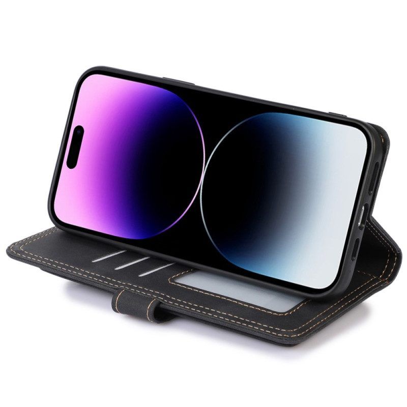 Schützen Sie Ihr Iphone 14 Pro Mit Dieser Klapphülle, Die Mit Einer Verspiegelten Vordertasche Und Einem Riemen Ausgestattet Ist.