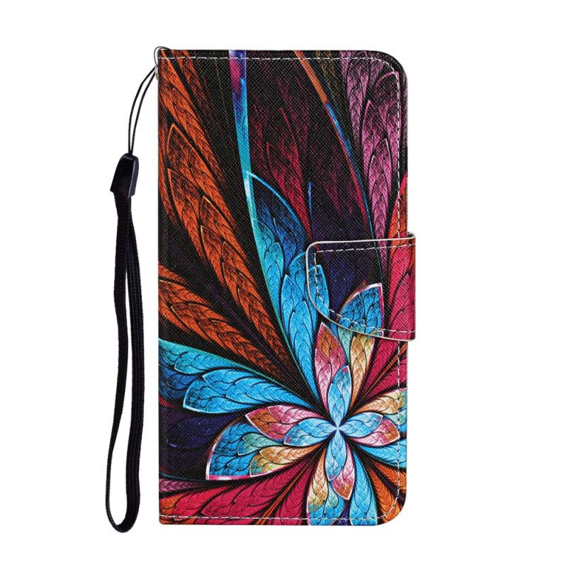 Lederhüllen Samsung Galaxy A52 4G / A52 5G Schwarz Bunte Blumen Mit Einem Riemen